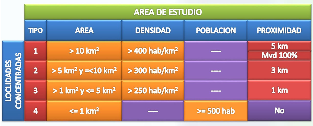 Son poblaciones concentradas aquellas que cumplen con los criterios de área, densidad de población o cantidad de población, definidos en el cuadro 1. Las localidades que no cumplen los criterios definidos en los tipos 1, 2, 3, 4 se consideran dispersas.